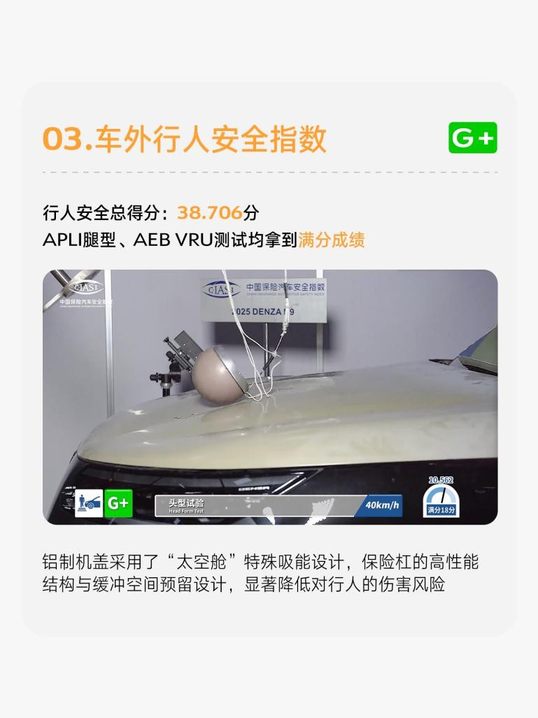 真正的安全,应该是全方位的安全考量。腾势N9获得车外行人安全分指数G +评级,行人安全总得分为38.706分,APLI腿型、AEB VRU测试均拿到满分成绩。这源于腾势N9铝制机盖采用了“太空舱”特殊吸能设计,保险杠的高性能结构与缓冲空间预留设计,显著降低对行人的伤害风险,将安全从车内延伸至车外,让每一次出行都增添一份安心。