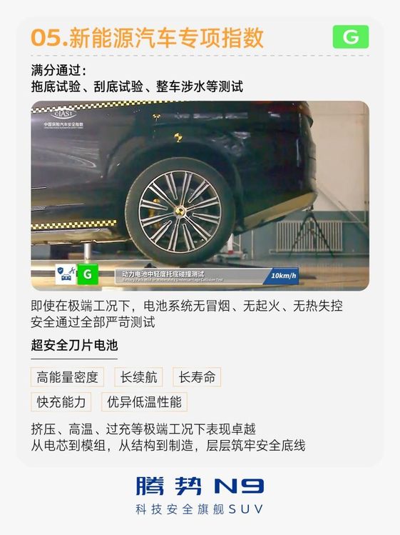 在新能源汽车专项指数中,腾势N9同样获得G评级,拖底试验、刮底试验、整车涉水试验等测试满分通过。这不仅证明了其在电池防护与电驱安全上的硬实力,更从“碰撞极端场景”到“日常用电安全”双维度,彻底打消了用户对电动车安全的顾虑。