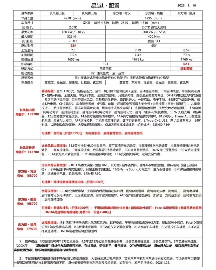虽然吉利星越L继续拿下了2025年燃油SUV年度销冠,但面对丰田卡罗拉锐放/锋兰达、RAV4荣放以及本田CR-V的不断“进攻”,星越L将带来26款长风系列——长风越山版、长风青云版,预售价分别为13.97万元、14.77万元。