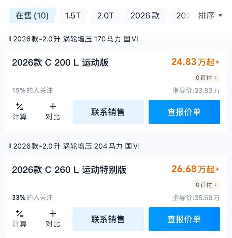拿2026款奔驰C级举例,为应对市场竞争,奔驰虽然为这款支柱车型换装了2.0T动力系统,全系标配L2级辅助驾驶,还新增前排座椅加热,除低配外全系标配柏林之声音响,指导价对比25款车型也上调了几千元。