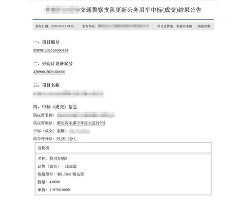 在全国多地政府的实际采购中,比亚迪已成为警车队伍中的“高频面孔”。公开的政府采购公告显示,安徽合肥、辽宁锦州、陕西西安、湖北孝感,再到贵州黔南,多地公安系统的警车采购项目中都出现了比亚迪旗下车型的身影。这些车型覆盖了秦PLUS、宋Pro、宋PLUS等多款主力产品,应用于日常巡逻、刑事侦查等多种执法执勤场景。