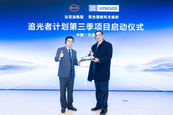 2026年1月26日,比亚迪与联合国教科文组织在天津迪空间正式举行“追光者计划”第三季项目启动仪式,比亚迪携手联合国教科文组织共建新生态。双方将依托比亚迪在新能源技术领域的核心优势,结合联合国教科文组织在可持续发展领域的深厚积淀,共同构建可持续发展公益合作新生态。
