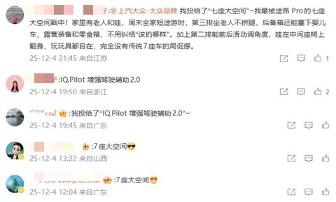 在评选互动中,“七座大空间”与“IQ.Pilot增强驾驶辅助2.0”成为网友投票关注的两大焦点。不少用户留言支持途昂Pro的大空间:“家里有老人和小孩,周末全家出游时,第三排坐老人不挤腿,后备箱还能放下婴儿车、露营装备,不用再纠结该扔哪样。”同时,IQ.Pilot增强驾驶辅助系统2.0凭借“实时感知路况,人机共驾更安心”的出色体验,获得大量网友的选择,成为高票人气配置之一。真实用户的声音,印证了途昂Pro在实用与科技感层面的双重吸引力。