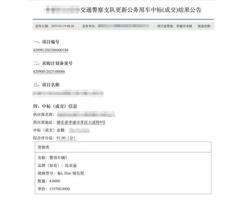 这种变化不止在长沙。翻看各地的政府采购公告,你会发现比亚迪已是警车采购名单里的“高频词”。安徽、辽宁、陕西、湖北、贵州……全国很多地方的公安系统,都不约而同地选择了秦PLUS、宋Pro、宋PLUS等车型,投入到日常巡逻、侦查等各种任务中。