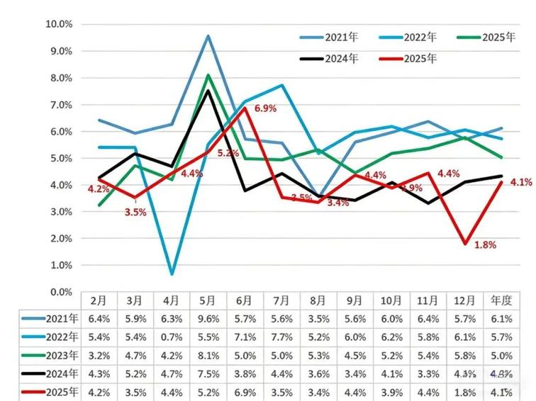 时间回到2021年,当年的行业利润率为6.1%。随后,2022年行业利润率为5.7%,2023年行业利润率为5%,2024年行业利润率为4.3%。到了2025年,行业利润率再创新低,尤其是当年12月的利润率低至1.8%,让赔本赚吆喝的市场怪象一览无余。