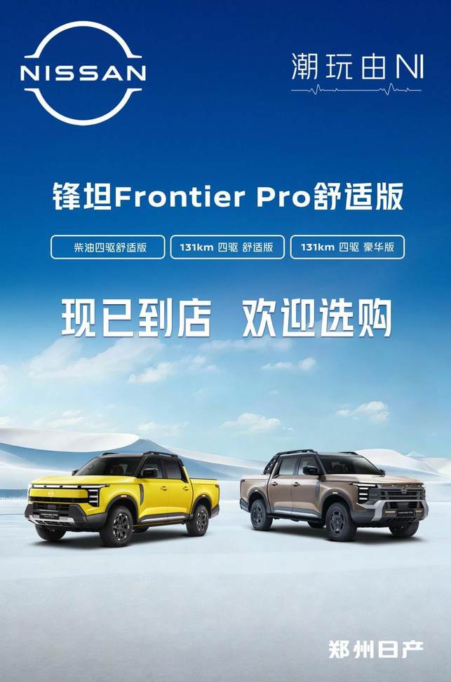 是时候为生活换个剧本了!即日起,郑州日产锋坦Frontier Pro三款车型——柴油四驱舒适版、131km四驱舒适版与131km四驱豪华版已陆续抵达全国经销商展厅,为NI推开一扇通往多元潮玩生活的大门,是NI探索未知、拓展生活边界的最佳搭档。