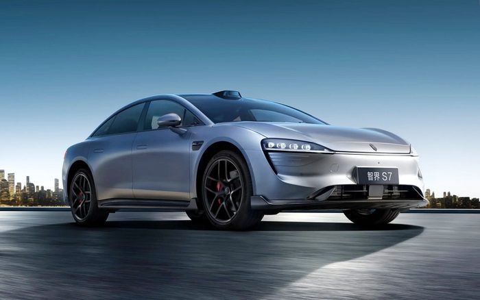 其次就是智界S7,该车定位同样是纯电动中大型轿车,采用的是单电机/双电机驱动,CLTC纯电续航里程705公里起,同样支持高压快充,车长4971mm,轴距为2950mm,包括哨兵模式、透明底盘、全速自适应巡航等都属于标配,入门就是高配也是该车最为诚意的体现。