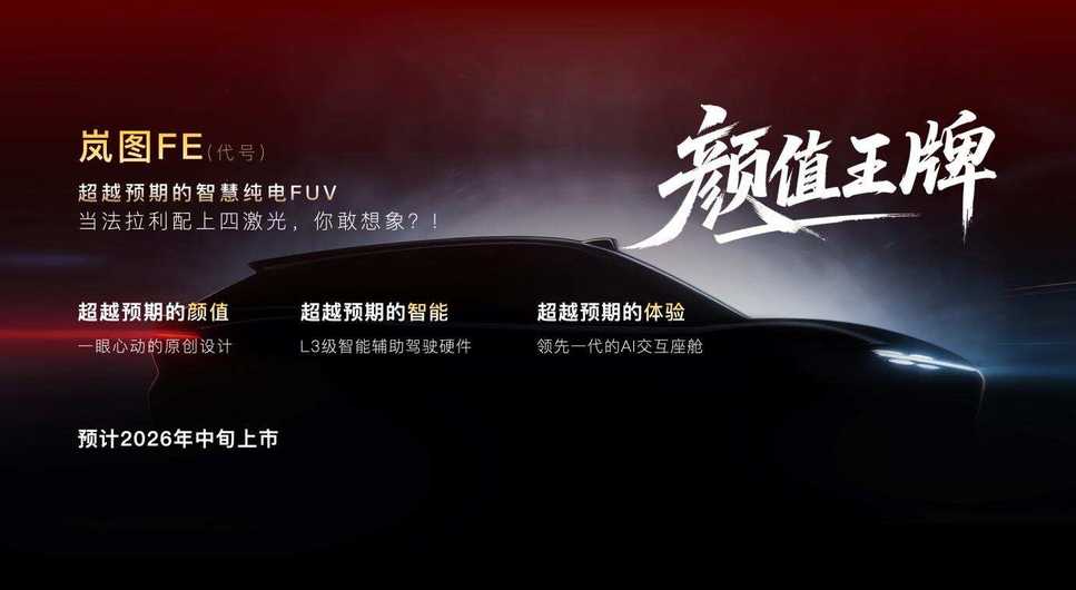 作为一款超越预期的智慧纯电FUV,岚图FE(代号)以超越预期的造型设计,赋予车型个性化的情感化表达,满足年轻用户独特的审美需求。此外,它将配备四激光雷达感知系统,搭载L3级智能辅助驾驶硬件,以及领先一代的AI交互智能座舱,为用户提供超越预期的智驾,和超越预期的AI交互体验。该车型将于2026年中旬上市,邵明峰表示:“岚图FE是岚图与华为乾崑的一次联手合作的全新起点,它不只是心中的热爱投射,更是一次彻底‘叛逆’,此款车型将科技的魅力与最原始的热爱融合一体,将成为年轻人心中的 Dream Car。”