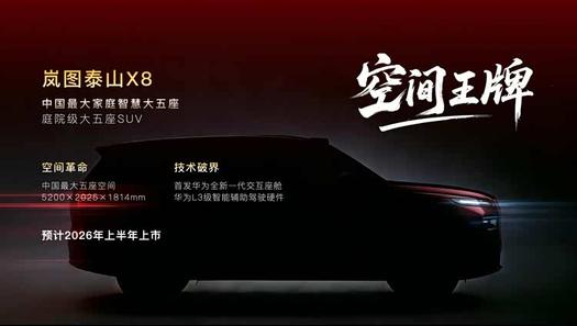 岚图全新推出的“庭院级大五座SUV”岚图泰山X8,致力于构建一个“可移动的家庭生活空间”,为中国家庭用户提供空间体验与智能出行解决方案。该车车长5200mm,宽2025mm,高1814mm,是“国内最大家庭智慧大五座SUV”,宽敞座舱设计可满足儿童自由活动、长辈舒适休憩等多元家庭出行需求,真正实现“无束缚”的全家旅程。在智能化方面,岚图泰山X8将搭载华为最新一代智能座舱系统,并配备L3级智能辅助驾驶硬件,进一步强化其在高端新能源SUV市场的核心竞争力。该车型将于2026年上半年正式上市,是岚图扩充SUV产品矩阵的重要车型。