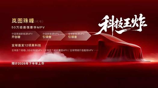 作为中国高端新能源MPV的开创者,岚图汽车始终以代代领先为标准,推出的岚图梦想家稳居高端MPV销量冠军,并在2024年、2025年蝉联MPV用户净推荐值第一。2026年,岚图汽车将完成MPV系列化布局,重磅加推一款“50万级最强豪华MPV”,代号“珠峰”,与岚图梦想家形成组合,剑指全品类MPV销冠及全球新能源MPV引领者地位。该车型将全球首发12项黑科技,是全球首搭L3级自动驾驶MPV和情绪价值最高的MPV,将实现智能化、人车交互与豪华体验的全面引领,重新定义MPV的价值天花板。该车型将于2026下半年上市,成为岚图汽车夯实MPV领导地位的核心力作。