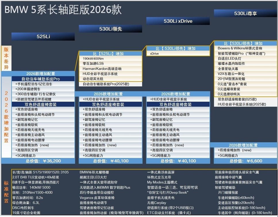 至于动力方面,新款宝马5系将继续搭载2.0T高/低功率发动机,匹配48V轻混系统。其中,525Li车型最大功率140kW(190马力),530Li车型最大功率190kW(258马力),传动系统均匹配8速手自一体变速箱+换挡拨片。底盘采用前双叉臂/后多连杆式独立悬挂,并提供xDrive四驱系统。