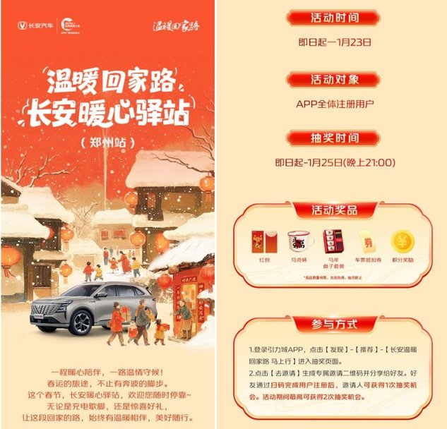 为构建全天候、多渠道的服务体系,长安汽车同步开启长安“引力域”APP线上温暖平台。返乡人员可参与APP内“长安温暖回家路马上行”抽奖赢好礼,现场扫码注册更可解锁专属权益,实现线上线下温暖相伴。