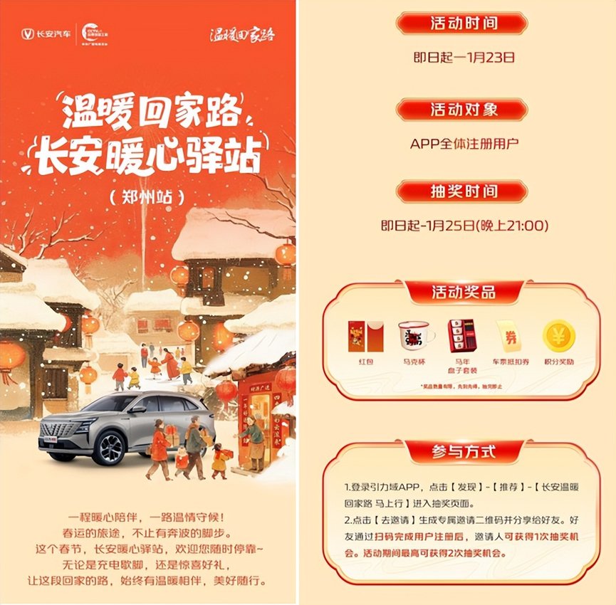 为构建全天候、多渠道的服务体系,长安汽车同步开启长安“引力域”APP线上温暖平台。返乡人员可参与APP内“长安温暖回家路 马上行”抽奖赢好礼,现场扫码注册更可解锁专属权益,实现线上线下温暖相伴。