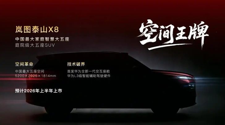 岚图全新推出的“庭院级大五座SUV”岚图泰山X8,致力于构建一个“可移动的家庭生活空间”,为中国家庭用户提供空间体验与智能出行解决方案。该车车长5200mm,宽2025mm,高1814mm,是“国内最大家庭智慧大五座SUV”,宽敞座舱设计可满足儿童自由活动、长辈舒适休憩等多元家庭出行需求。在智能化方面,岚图泰山X8将搭载华为最新一代智能座舱系统,并配备L3级智能辅助驾驶硬件,进一步强化其在高端新能源SUV市场的核心竞争力。该车型将于2026年上半年正式上市,是岚图扩充SUV产品矩阵的重要车型。