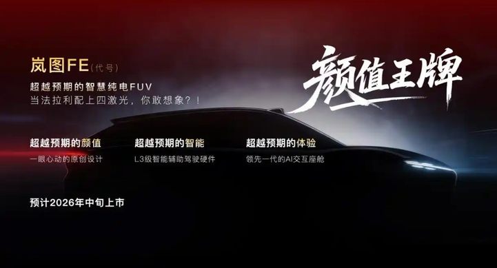 作为一款超越预期的智慧纯电FUV,岚图FE(代号)以超越预期的造型设计,赋予车型个性化的情感化表达,满足年轻用户独特的审美需求。此外,它将配备四激光雷达感知系统,搭载L3级智能辅助驾驶硬件,以及领先一代的AI交互智能座舱,为用户提供超越预期的智驾,和超越预期的AI交互体验。该车型将于2026年中上市,邵明峰表示:“岚图FE是岚图与华为乾崑的一次联手合作的全新起点,它不只是心中的热爱投射,更是一次彻底‘叛逆’,此款车型将科技的魅力与最原始的热爱融合一体,将成为年轻人心中的 Dream Car。”