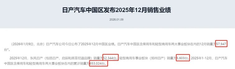 先看整体数据,2025年1-12月,日产中国包括乘用车和轻型商用车在内,全年累计销量是653024台,对比2024年的696631台,下滑了6.26个百分点。尤其是12月份单月,只卖出了57947台,同比下滑幅度达到22.65%,年末冲量没能达到预期,看得出来市场压力确实很大。