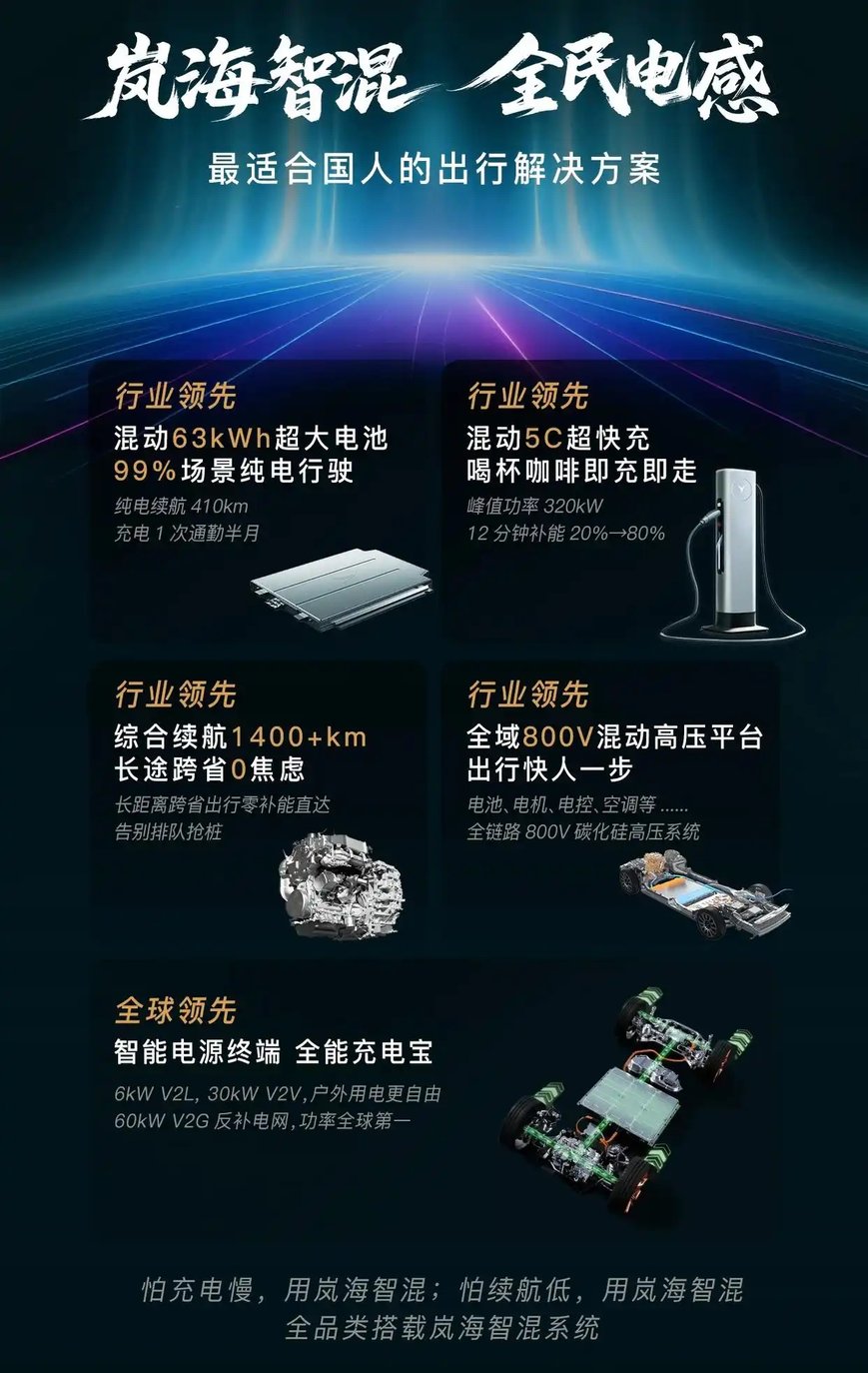 其次是岚海智能超混系统。这是全球首个全品类的800V高压混动技术,可实现5C超级快充,20-80%充电时间仅为12分钟,同时还能实现CLTC工况下410km的纯电续航以及1400km的综合续航。