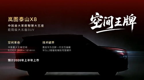 岚图泰山X8同样搭载华为四激光雷达系统,并将首发华为全新一代交互座舱。尺寸方面,泰山X8长宽高分别达到5200/2025/1814mm,定位为五座大型SUV,它将填补岚图品牌在大五座旗舰SUV领域的空白。