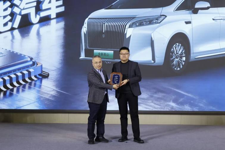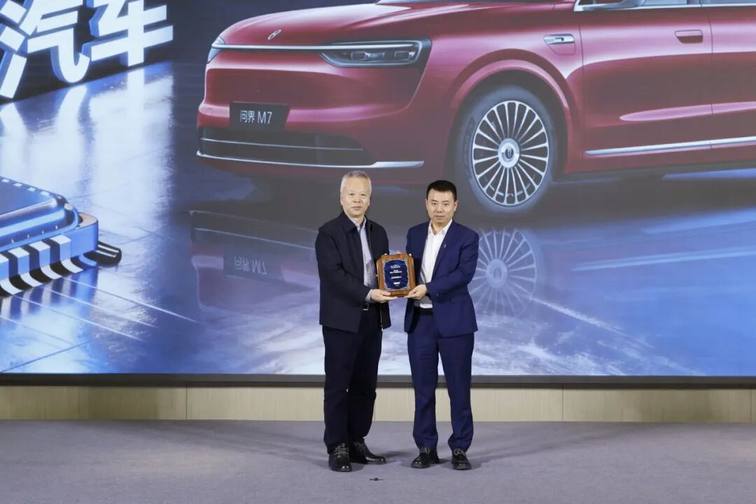 上海交通大学汽车研究院教授殷承良为腾势汽车品牌公关经理王志鹏授牌