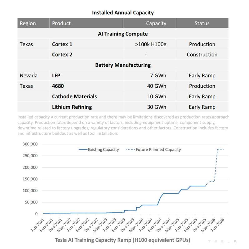 特斯拉将致力于实现 100GW 的太阳能电池产能,除了为人工智能数据中心供电外,利用太阳能和储能系统,还可以为电网增加大规模的可用容量。