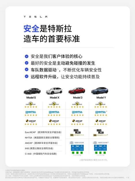 S3XY 全系车型获全球权威安全机构五星安全评级:在美国 NHTSA、欧洲 Euro NCAP、中国 C-IASI、澳大利亚 ANCAP 等机构均获 “五星安全” 评级,2025 年现款 Model Y 再度斩获 Euro NCAP 与 ANCAP 五星认证。