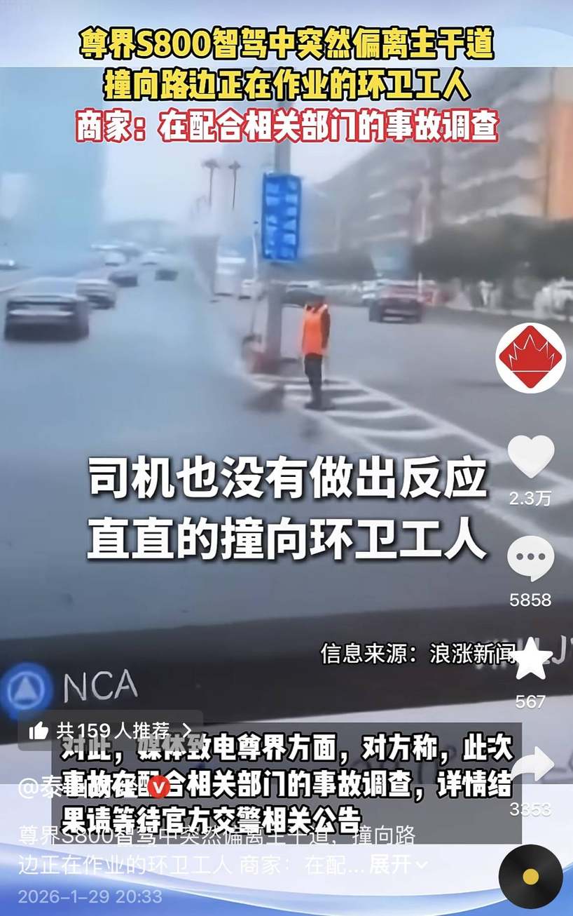 【文/深度评车&财经三剑客】据山东文旅传媒集团旗下财经媒体泰山财经报道,近日,一网友在社交平台反映,1月26日,湖南省长沙市开福区,一段行车记录仪画面显示,一辆尊界S800在自动驾驶状态下行驶时,撞向路边正在作业的环卫工人。
