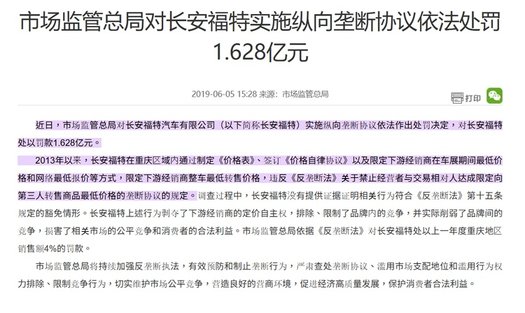 图:国家市场监督管理总局对长安福特罚款1.628亿元。