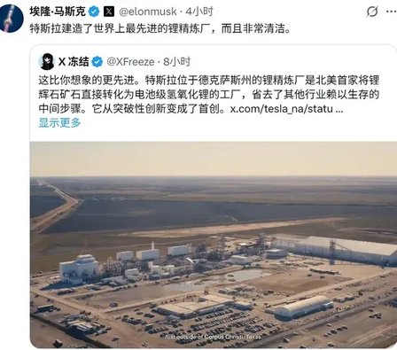 1月15日,特斯拉首席执行官埃隆·马斯克在社交平台宣布,特斯拉锂精炼厂现已投入运营。