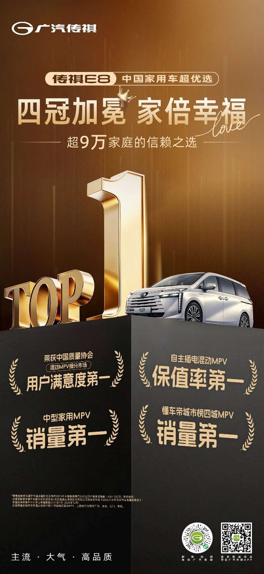 春节将至,团圆在即。对于多孩家庭而言,一辆既能承载全家欢乐、又能轻松应对复杂路况与停车场景的座驾,已成为幸福出行的“刚需”。近日,广汽传祺E8以连续斩获四项权威第一的卓越成绩,正式加冕“四冠王”,用实力诠释“家有E8,家倍幸福”的温暖承诺。
