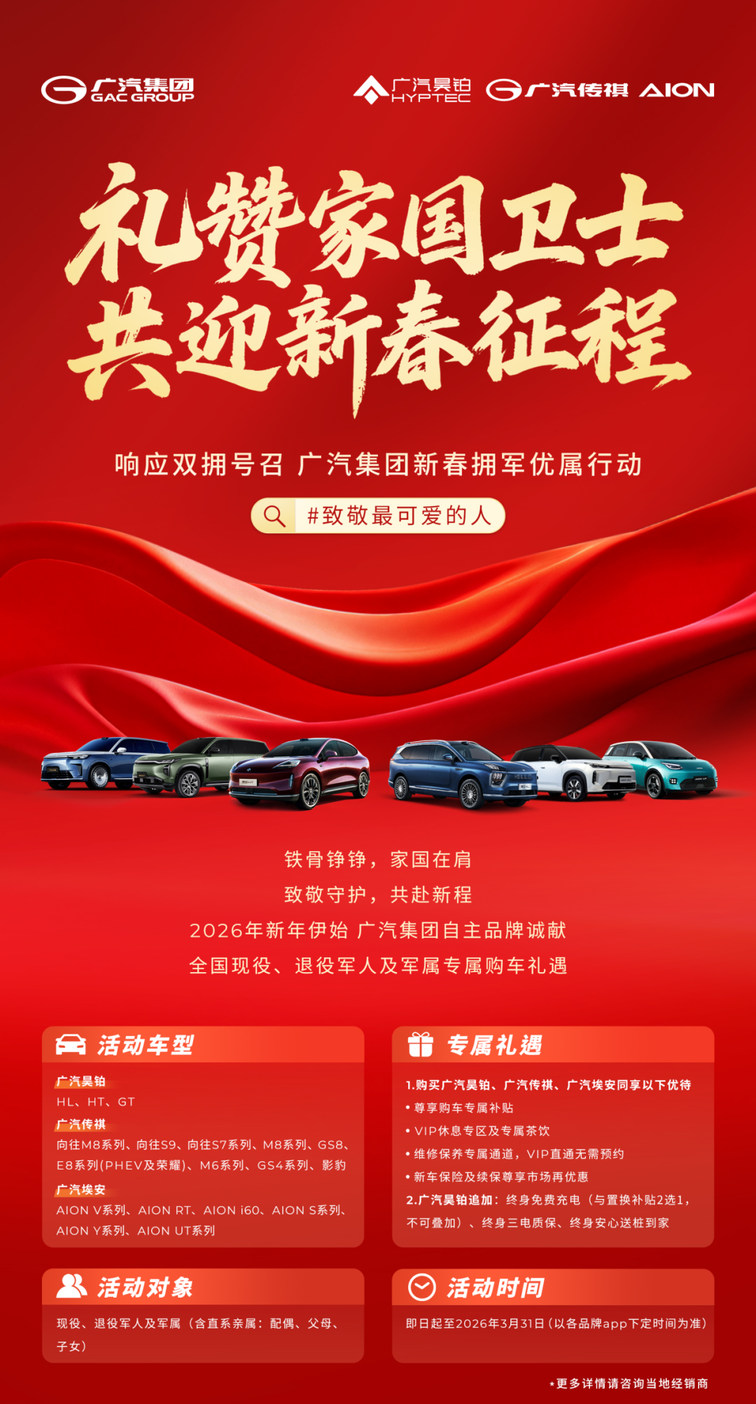 在2026年新春佳节即将到来之际,广汽集团积极响应国家“双拥”号召,携旗下广汽昊铂、广汽传祺、广汽埃安三大自主品牌,正式启动“礼赞家国卫士,共迎新春征程”拥军优属行动,向广大现役、退役军人及军属致以最崇高的敬意。