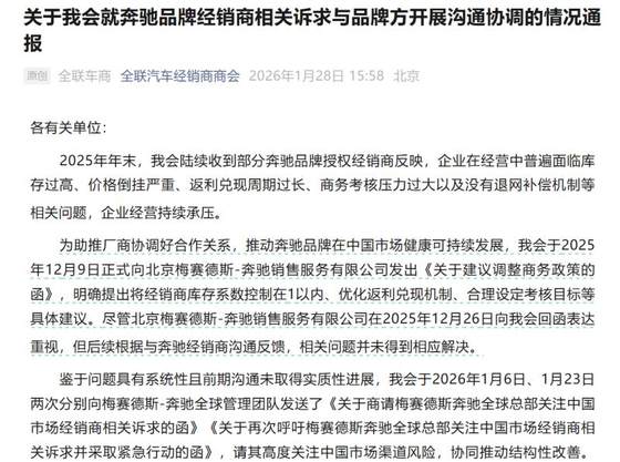 鉴于首次沟通未取得实效,商会分别于2026年1月6日、23日两次向北京梅赛德斯-奔驰销售服务有限公司发函,同时将相关问题直接反馈至奔驰全球管理委员会主席康林松。