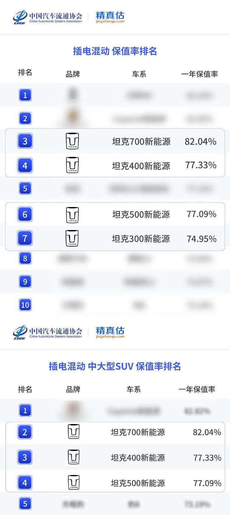 翻开榜单,坦克展现出的统治力令人称道:坦克300三年保值率高达65.90%,稳居紧凑型SUV全品类第一;坦克300 Hi4-T一年保值率74.95%,荣膺插混紧凑SUV冠军。更令人瞩目的是高端战场,坦克700 Hi4-T以82.04%的一年保值率,直接跻身插混保值率榜单前三,与问界M9、保时捷Cayenne等豪华旗舰并肩。
