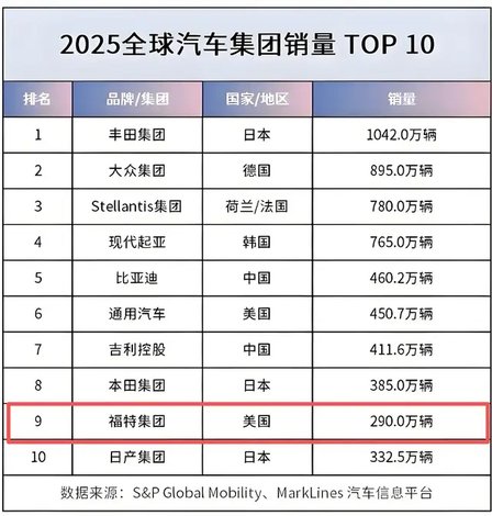 把福特跟马自达相比,确实有点小看福特了。福特汽车集团一度以400万+的销量位居全球前六,2025年即使掉至290万辆,仍然位居全球第九。