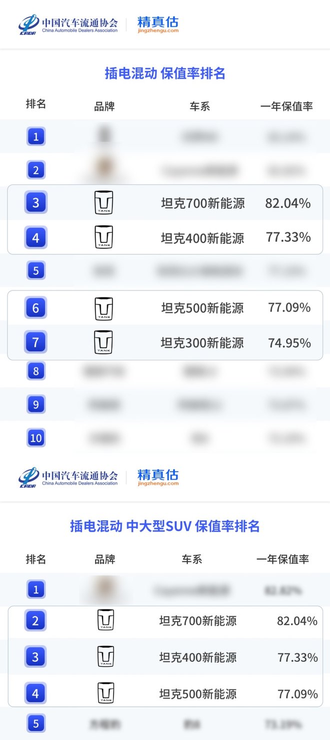 翻开榜单,坦克展现出的统治力令人称道:坦克300三年保值率高达65.90%,稳居紧凑型SUV全品类第一;坦克300 Hi4-T一年保值率74.95%,荣膺插混紧凑SUV冠军。更令人瞩目的是高端战场,坦克700 Hi4-T以82.04%的一年保值率,直接跻身插混保值率榜单前三,与问界M9、保时捷Cayenne等豪华旗舰并肩。
