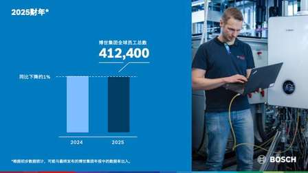 博世多个重点市场的艰难形势对各业务板块的销售发展均产生影响。“博世也明显感受到2025年全球经济增长乏力带来的影响,”博世集团董事会成员及首席财务官Markus Forschner博士表示,“尽管面临多重不确定性与贸易壁垒,我们仍在多数市场中保持了自身竞争力。”智能出行业务领域销售额为560亿欧元,较上年同期微增0.3%,调整汇率影响后,实际增幅为3.1%;工业技术业务领域销售额达65亿欧元,尽管机械工程和建筑行业形势严峻,该业务仍通过0.9%的微弱增长维持了上年水平,调整汇率影响后,增幅为3.2%;消费品业务领域销售额下降1.9%,至199亿欧元,但若剔除汇率影响,则实现4%的增长。这一表现主要源于消费者支出意愿持续低迷;能源与建筑技术业务领域销售额为84亿欧元。虽然建筑市场整体疲软,该业务领域仍实现12.3%的同比增长(调整汇率影响后增幅达15.3%),其中暖通空调业务收购所带来的销售收入,超过了出售建筑科技业务所带来的影响。