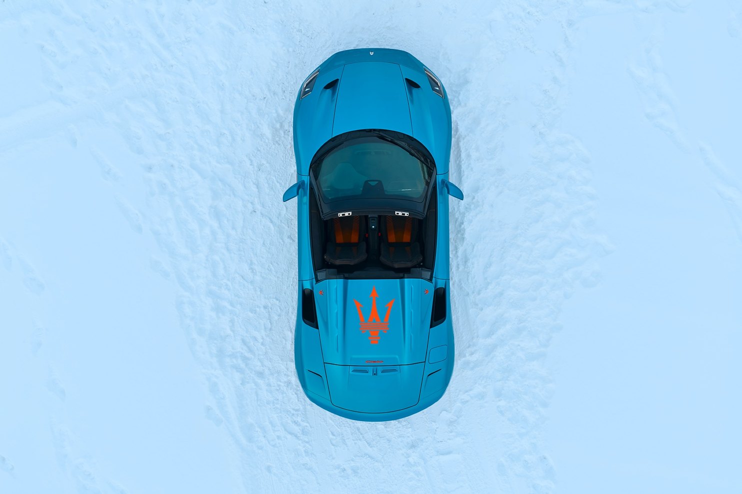 在这片浸润独特意境的冰雪盛境中,三叉戟品牌的专属定制座驾,凭借充满个性风格的AI幻彩蓝(AI Aqua Rainbow)涂装,登场即成为全场焦点。这款独特的虹彩漆面,可随光线流转幻化层叠色调,宛若冰川凝炼的澄澈晶面,清透莹润,意境天成。与此明亮冷冽的基底形成强烈对比的,是车身各处专属定制的亮橙饰件,以热烈质感勾勒出温暖跃动的能量感,冷暖相映,张力尽显。橙色的梦想线条涂装、 驼峰式后舱盖上的橙色三叉戟徽标、外部标识、玛莎拉蒂字母以及Cielo徽标,共同构成了醒目而独特的图形元素,于皑皑雪境中卓然生辉。高光黑色下包围与20英寸Cyclonic高光黑色Fuoriserie专属轮辋相得益彰,辅以橙色制动卡钳,及同色呼应的橙色轮毂盖与三叉戟精饰细节,令这份视觉冲击力再度进阶。