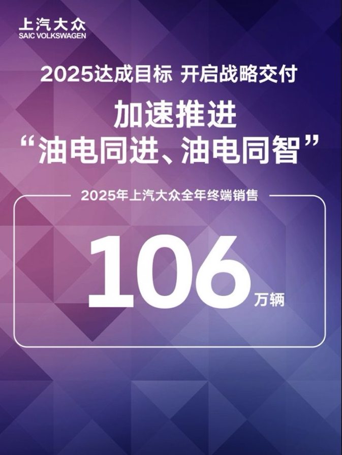 当2025年中国汽车行业终于从“价格战”的硝烟中逐渐抽身,转向“价值战”的深水区时,上汽大众以一份稳健的成绩单,为这场范式转变提供了一个坚实的注脚:全年终端销量106万辆,稳居“百万俱乐部”。这一数字远不止是市场份额的象征,它更像是一个信号,标志着这家合资巨头在喧嚣的市场环境中,选择了一条更艰难但也更可持续的道路——回归价值本质,锻造体系竞争力。