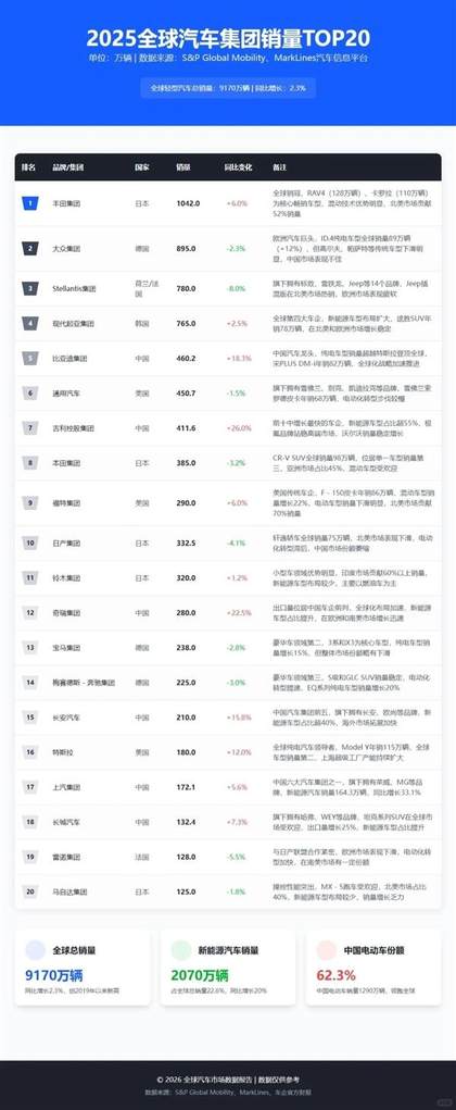迈入2026年,2025年全球车市的成绩单陆续浮出水面,备受关注的”2025全球汽车集团销量TOP10”榜单也在最近正式发布。这份榜单不光能看出全球车企的竞争情况,还能明显感受到三大变化:新能源早就成了主流,“出海”成了车企增长的关键,而且强的越强、弱的越弱的趋势越来越明显——传统巨头没以前那么稳了,中国车企靠着技术和产品的优势,已经从跟着跑变成领着跑,全球车市的格局悄悄变了样,接下来就一起看看闯进前十的这些汽车集团,到底表现如何。