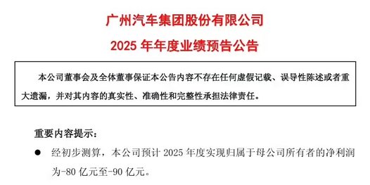 近日,广汽集团发布2025年年度业绩预告。经初步测算,公司预计2025年度归属于母公司所有者的净利润将出现亏损,区间为-80亿元至-90亿元;扣除非经常性损益后的净利润预计为-89亿元至-99亿元。要知道,在今年前三季度,它的净亏损还是43.12亿元,现在直接亏损超过了80亿,称得上是资金压力凸显。