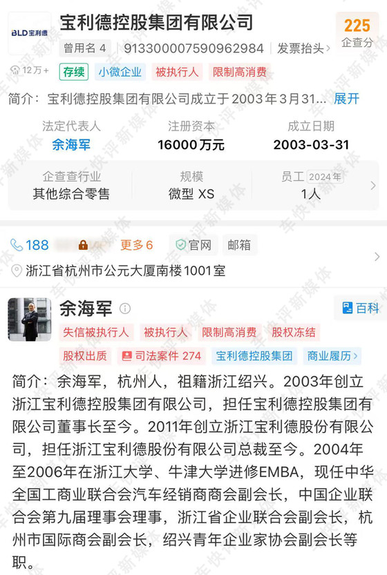 目前,宝利德控股集团有限公司法人代表兼董事长余海军已经被列为失信被执行人,涉及的司法案件多达274起。
