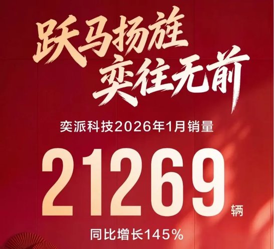 奕派科技1月销量21269辆,同比增长145%。