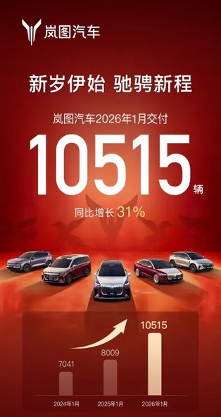 岚图汽车1月销量10515辆,同比增长31%。