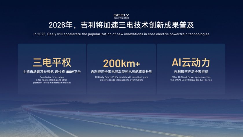 在HEV混动领域,吉利将在2026年上半年推出全球新一代油电混动技术——i-HEV智能双擎。作为全球首个应用“AI云动力”的油电混动系统,i-HEV可将HEV百公里油耗降至3L,整车功率较主流HEV提升至少20%,让燃油车同样拥有出色电感体验。今年,吉利汽车将陆续推出4到5款全新混动车型。