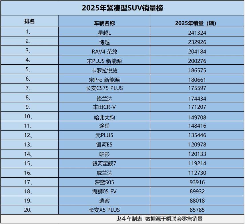 紧凑型SUV卖火了 2025年销量榜 16款销量过十万 锋兰达第八