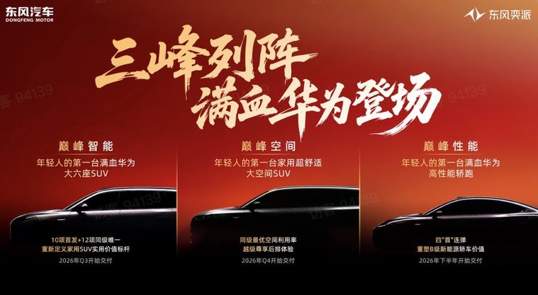 “巅峰性能”方向:满血华为高性能轿跑,将搭载华为全家桶,配合东风自研混合固液电池实现1000公里续航等。