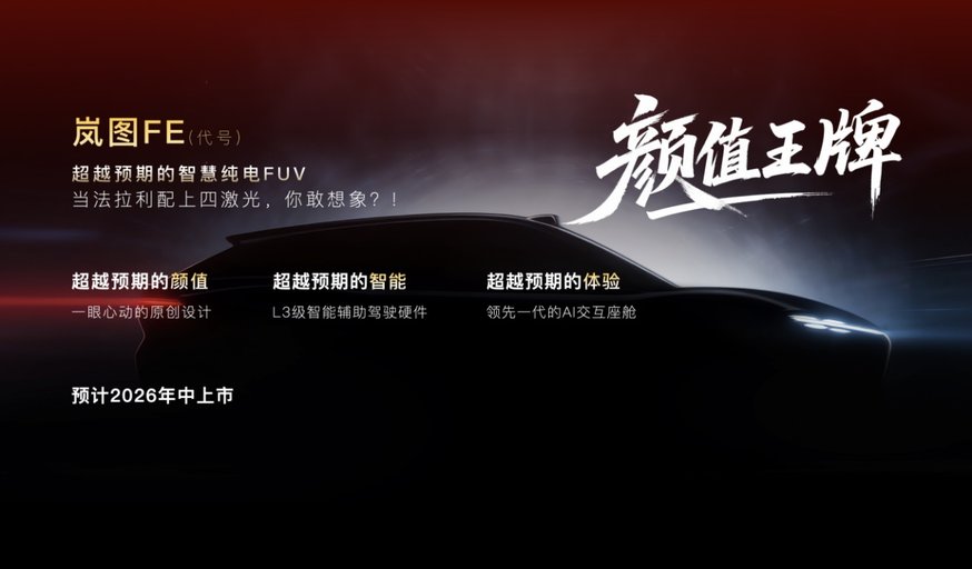 作为超越期待的智慧纯电FUV,岚图FE(代号)以超越预期的造型设计,赋予车型个性化的情感化表达,满足年轻用户独特的审美需求。该车型将配备四激光雷达感知系统,搭载L3级智能辅助驾驶硬件,以及领先一代的AI交互智能座舱,为用户提供超越预期的智驾,和超越预期的AI交互体验,并计划于2026年年中上市。