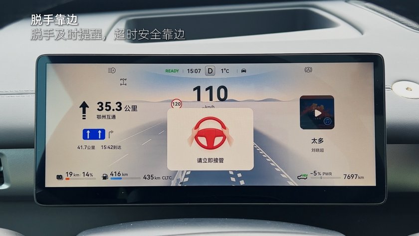 而脱手靠边功能则针对长途驾驶中驾驶员疲劳驾驶、双手长时间脱离方向盘的情况,系统会先发出10秒接管提醒,若驾驶员未及时响应,车辆将主动控制车速平稳靠边停车,最大限度保障人车安全。