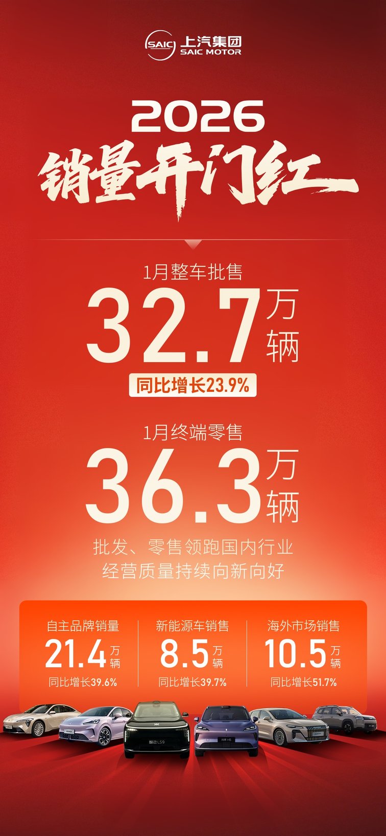 (2026年2月2日,上海)上汽集团发布1月销量数据,继去年全年整车销量实现同比两位数增长后,2026年上汽集团再迎市场开门红:1月实现整车批售32.7万辆,同比增长23.9%,终端零售36.3万辆,批发、零售销量规模双双领跑国内汽车行业,经营质量持续向新向好。其中,上汽自主品牌销售21.4万辆,同比增长39.6%;新能源车销售8.5万辆,同比增长39.7%;海外市场销售10.5万辆,同比增长51.7%。
