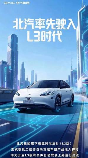 12月15日,极狐阿尔法S(L3版)正式获得工信部准入许可,可以在北京市京台高速、机场北线高速、大兴机场高速等路段开启最高时速80公里/小时的L3自动驾驶。