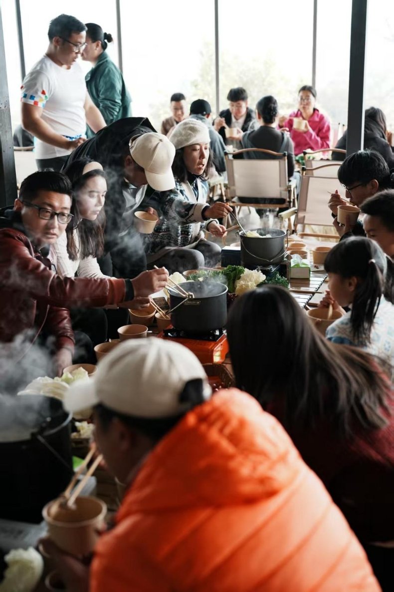午餐时段,蔬蜜院为嘉宾打造了一场有机主题乡村土鸡火锅盛宴。汤底用散养土鸡柴火灶熬制,核心食材则是良道有机农场当日清晨采收的新鲜时蔬——带着晨露的鲜蔬从田垄直达蔬蜜院餐桌,仅数小时便锁住新鲜。无需繁杂调味,蔬菜的自然清甜与土鸡的鲜香融合,让嘉宾尝到有机本味。席间,围绕蔬蜜院的体验与有机农业的交流不断,氛围温馨热烈,也让大家对蔬蜜院的有机休闲体验更添喜爱。